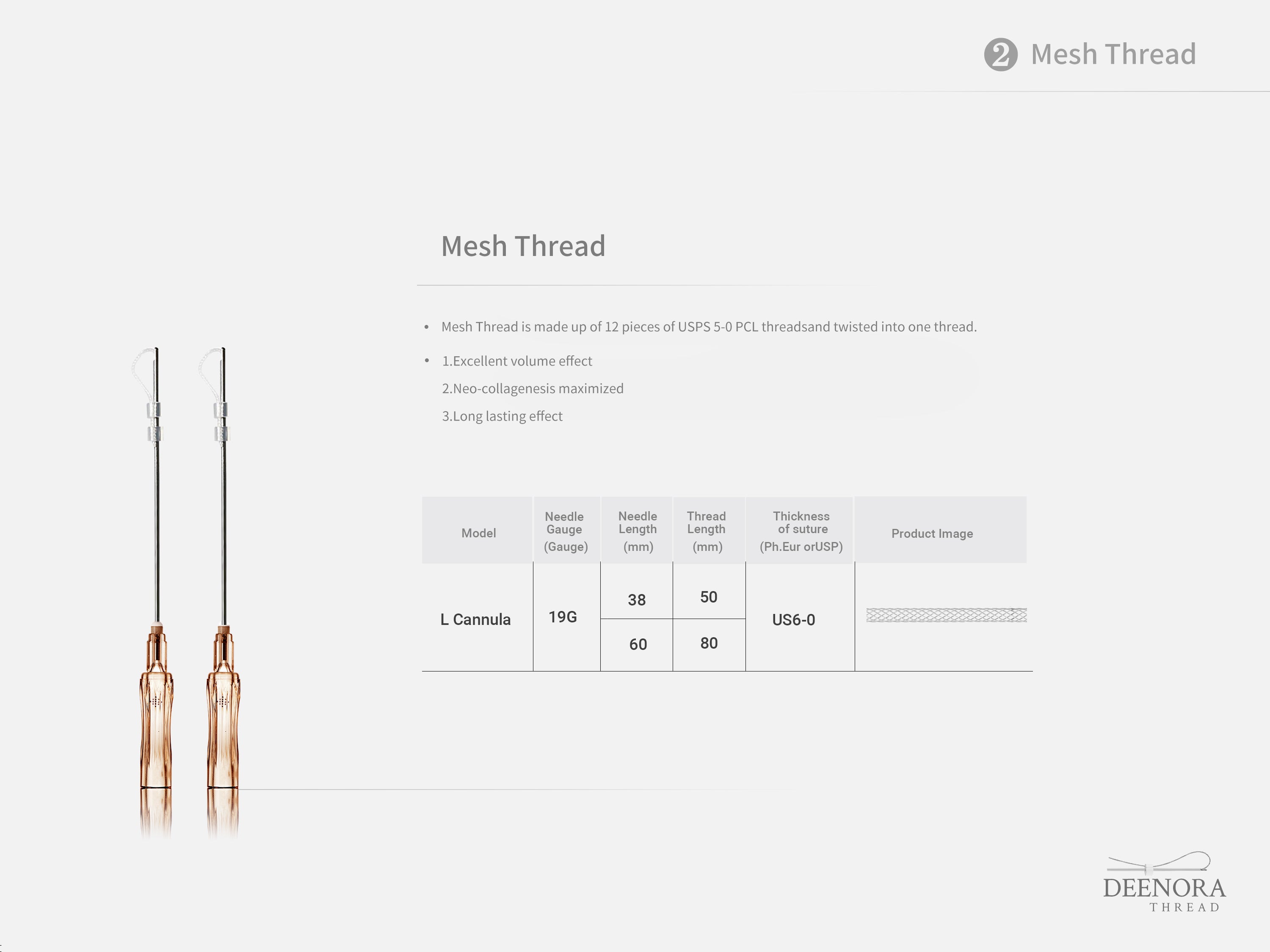 Deenora Thread is a kind of absorbable collagen line PDO (Polydioxanone),PLLA (Poly-L-Lactic Acid),PCL (Polycaprolactone) implanted in specificparts of the skin,stimulate collagen regeneration, promote blood circulation, so as to lift and tighten the drooping shin, achieve natural wrinkle elimination, facial enhancement effect.